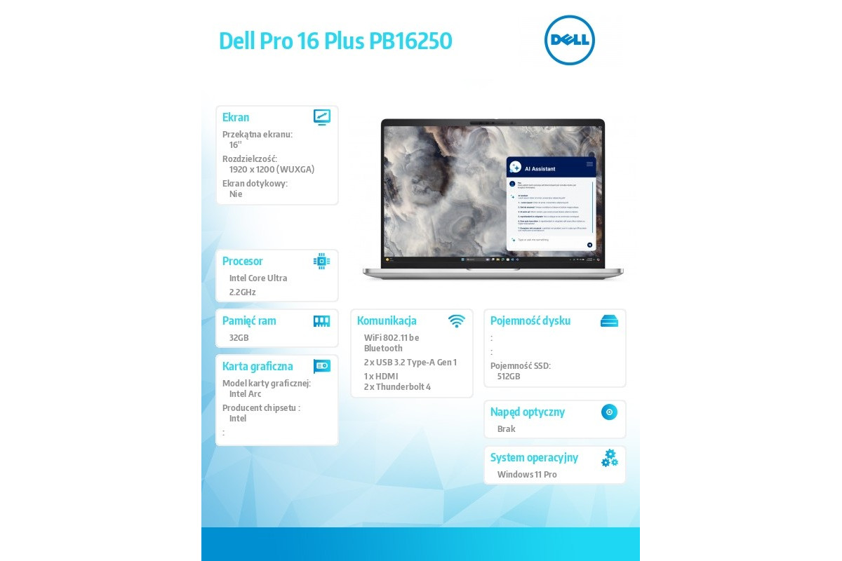 Dell Pro Plus 16" IPS PB16250 | Win11 Pro | Intel Core Ultra 7 268V | 32GB RAM | 512GB | FgrPr&SmtCd/FHD 3 lat gw. | Aluminium